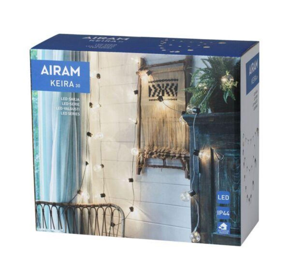 Ilmeikäs lamppusarja kirkkailla lampuilla ja mustavalkoisella kangasjohdolla. Led lämmin valkoinen, ei vaihdettava.