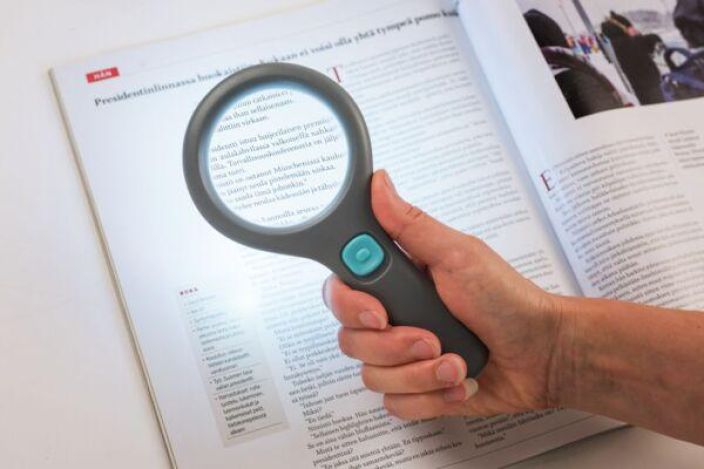 Led-valoilla varustettu suurennuslasi on heikkonäköisen oiva apu! Helppo käyttää: on/off-kytkin suurennuslasin varressa. Myös paristokotelo on suurennuslasin varressa. Lasin kehyksessä kolme led-valoa, suurennuslasissa kolminkertainen suurennus.
