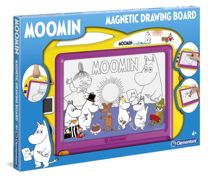 Muumi-aiheisessa piirustustaulussa on narulla kiinnitetty kynä, kolme leimasinta ja kätevä kantokahva.