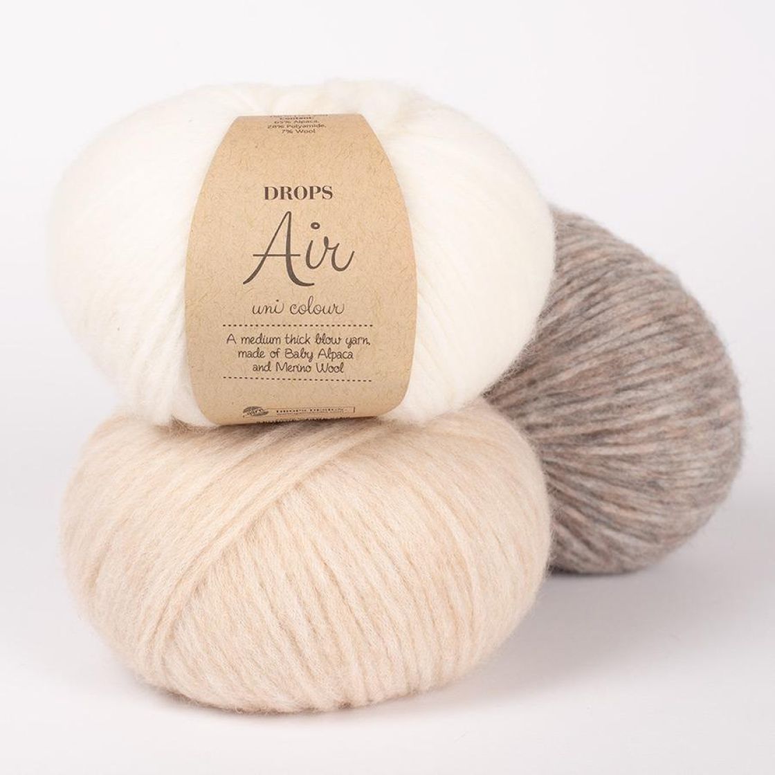 Drops Air on kevyt, ilmava lanka, joka tuntuu kauniilta ihoa vasten. Tämän ansiosta se sopii todella hyvin puseroihin, jakkuihin ja asusteisiin. Voit tehdä sekä kohoneuleita että palmikkoneuleita. DROPS Air-langasta tehdyt neuleet eivät kutita, eli kaikki pystyvät pitämään niitä.