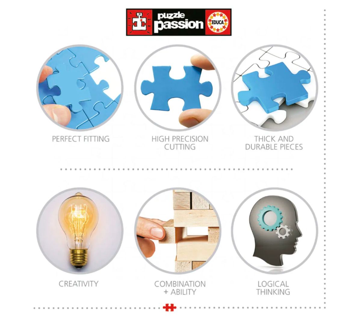 Educa® tarjoaa sinulle markkinoiden kattavimman valikoiman aikuisille suunnattuja palapelejä, joiden koot vaihtelevat 500:sta 42 000 palaan ja joissa on parhaat kuvat ja viihdyttävimmät hahmot.
