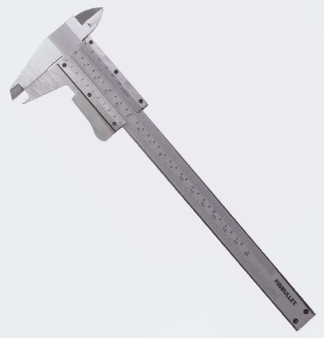 Finbullet kokometallinen työntömitta automaattilukituksella ja säilytyslaatikolla.