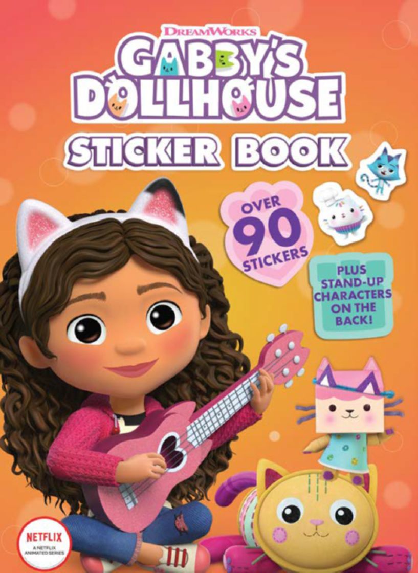 Gabby's dollhouse tarra- ja värityskirja sisältää 12 väritettävää sivua ja yli 90 tarraa.