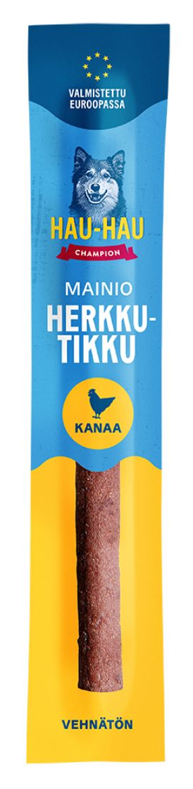 Hau-Hau Champion Mainio Herkkutikku Kanaa on herkullisen pehmeä ja maukas tuliainen koirakaverillesi. Vehnätön herkkutikku sopii hyvin niin koiran herkutteluhetkiin kuin palkaksi harrastuksiinkin. Mainio herkkutikku pysyy pehmeänä ja se on helppo pilkkoa pienempiin osiin vauhdikkaissakin tilanteissa. Mainiot herkut valmistetaan Euroopassa.