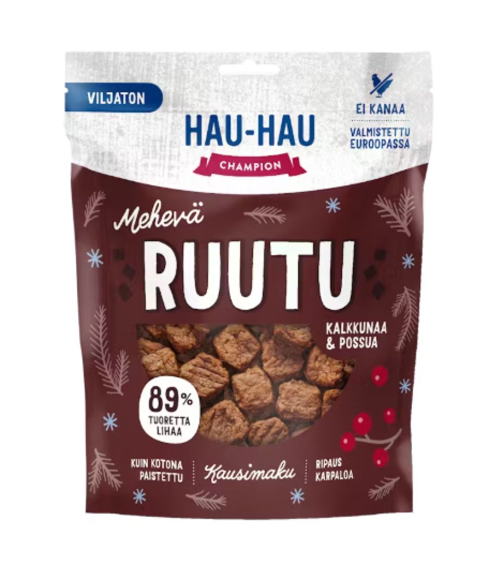 Näillä herkuilla valloitat koiraystäväsi sydämen hetkessä! Kausimaku Hau-Hau Champion Mehevä Ruutu Kalkkunaa ja possua on pyöritelty lihaisasta taikinasta, johon on lisätty ripaus marjapuristetta. Tuloksena syntyi kuin kotona paistettu koiran herkku, jonka huumaava tuoksu houkuttelee paikalle kaikki perheen hännänheiluttajat.