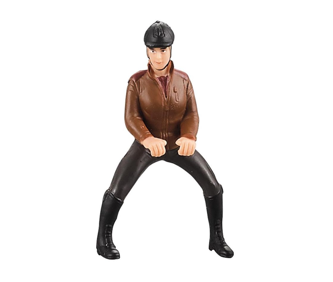 Ratsastaja tyttö, asusteena ruskea jakku, mustat housut.
