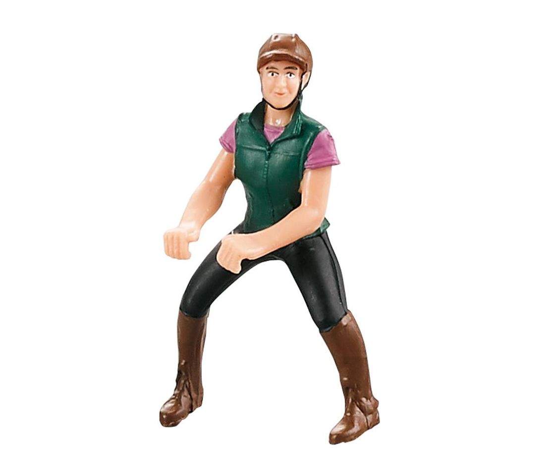 Ratsastaja tyttö, asusteena tummanvihreä liivi, mustat housut.