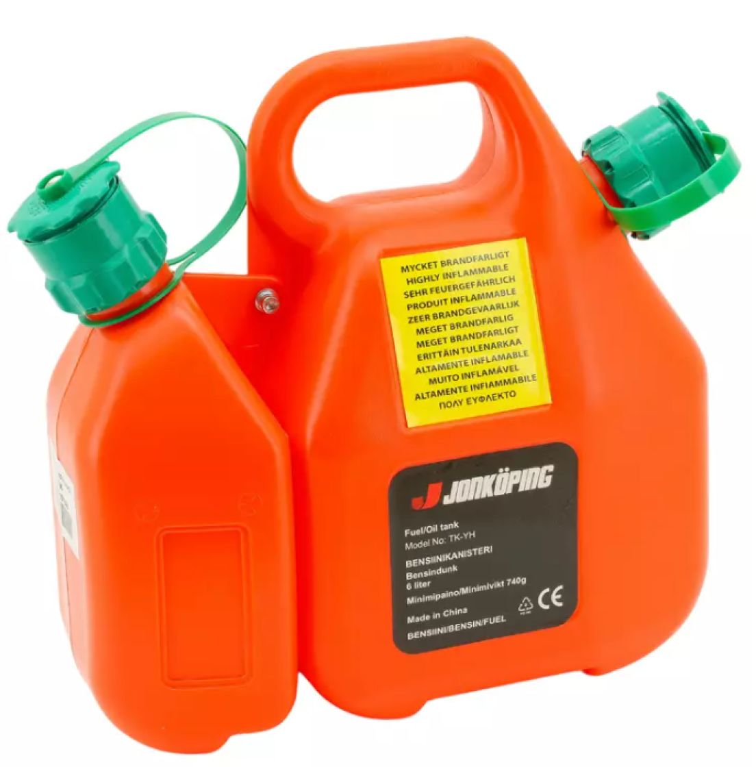 Joka metsurin käytännöllinen kombikanisteri jossa omat säiliöt bensiinille ja öljylle.