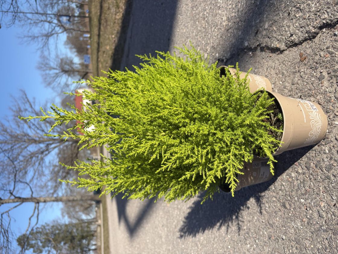 Kultasypressi sopii hyvin erilaisiin ruukku- ja laatikkoistutuksiin taustakasviksi.