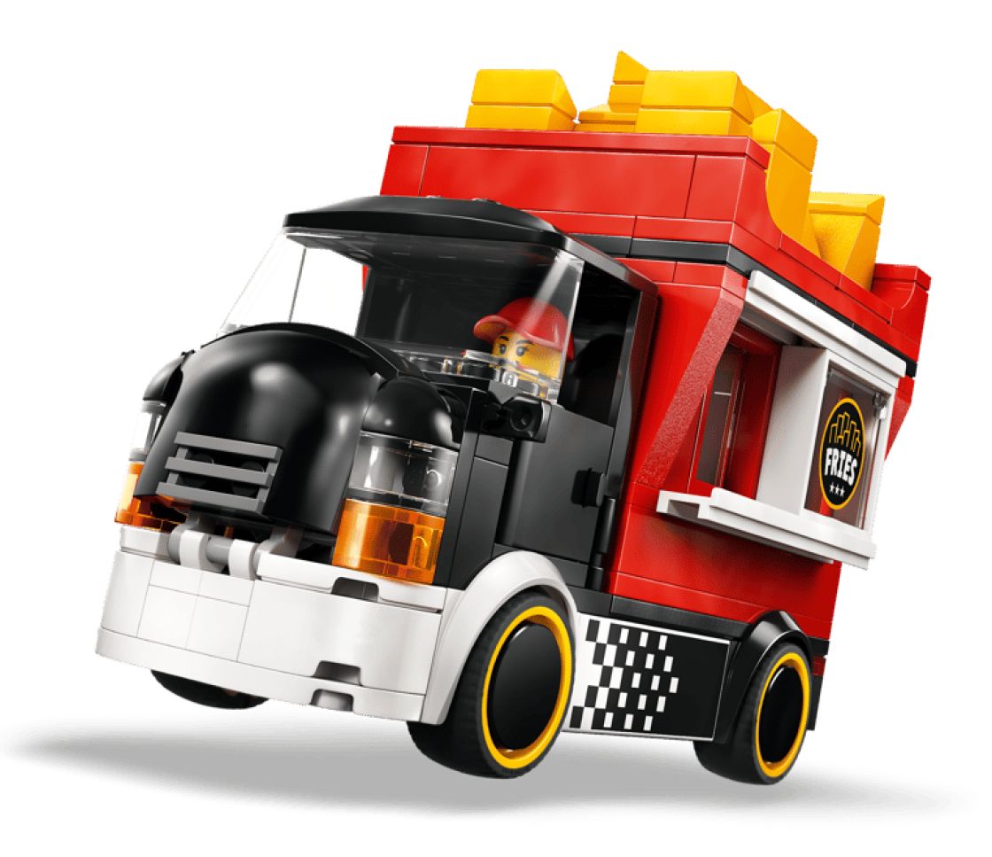 Värikkäässä ruoka-autossa on jättimäisen ranskanperunapaketin muotoinen irrotettava kioski. Irrotettavan katon alta paljastuu ruoanvalmistusalue, jossa on friteerauskeitin, mausteita ja liukuikkunalla varustettu palveluluukku. Pikaruoka-auton avautuvan konepellin alle kätkeytyy lelumoottori, ja mukana tulevat myyjän ja asiakkaan minihahmot.