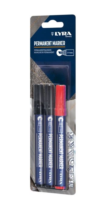 Viistokärkiset huopakynät pysyvällä, vettä hylkivällä musteella. Pakkauksessa kaksi mustaa ja yksi punainen tussi.