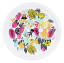 Pyöreä peltinen ja värikäs tarjotin Papaija-kuvituksella.