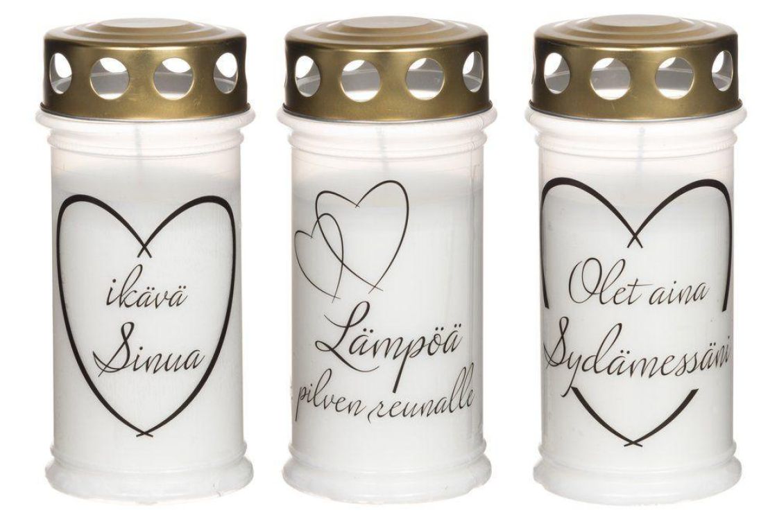 Hautakynttilä tekstillä ja kullanvärisellä metallisella tuulisuojalla. Paloaika noin 65 tuntia.