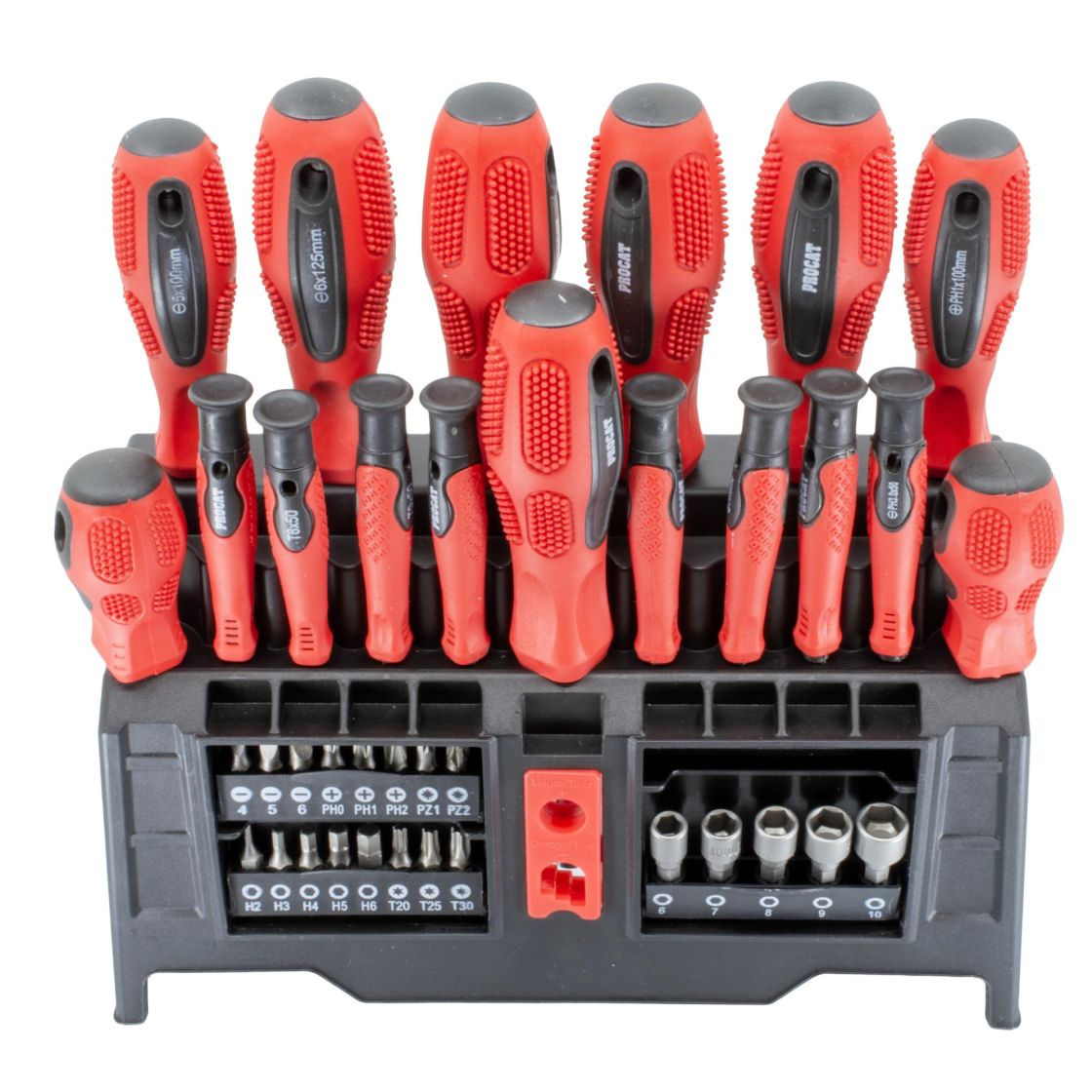 Monipuolinen 39-osainen ruuvimeisseli- ja konekärkisarja, jossa on Cr-V-teräksestä valmistetut työkalut sekä ergonomiset nypyillä varustetut kumikahvat erinomaisen pidon takaamiseksi. Sisältää magnetisoijan ja demagnetisoijan.