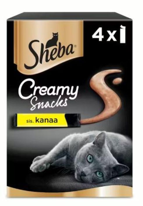 Sheba Creamy Snack on kermainen tahnaherkku kissoille jonka voi antaa sellaisenaan tai esimerkiksi ruoan kanssa. Suositus annos on korkeintaan pussi päivässä.