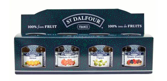 Aprikossylt: Aprikos 51 % (ursprung: eu och icke-eu), druv- och dadelsaftkoncentrat, geleringsmedel: pektin, citronsaft. Hallon-granatäppelsylt: Hallon 34,5 %, granatäpple 16,5 % (ursprung: eu och icke-eu), druv- och dadelsaftkoncentrat, geleringsmedel: pektin. Fikonsylt: Fikon 51 % (ursprung: eu och icke-eu), druv- och dadelsaftkoncentrat, geleringsmedel: pektin, citronsaft. 4-bärssylt: Bär 51% [Jordgubb 13 %, hallon 13 %, björnbär 13 %, körsbär 12 % (ursprung: eu och icke-eu)], druv- och dadelsaftkoncentrat, geleringsmedel: pektin, citronsaft.