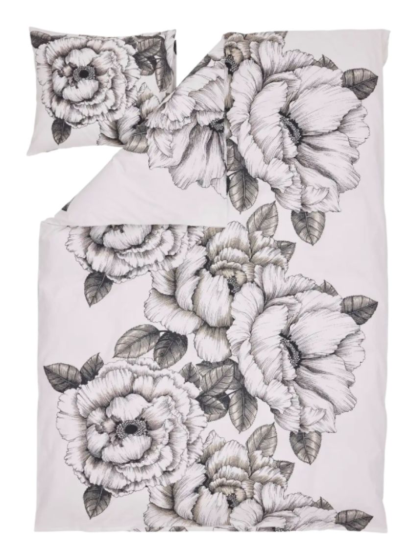 Alma-kuosissa komeilevat suuret ja näyttävät juhannusruusut. Alma-pussilakanasetti on valmistettu vastuullisesti pehmeästä 100% puuvillasta.