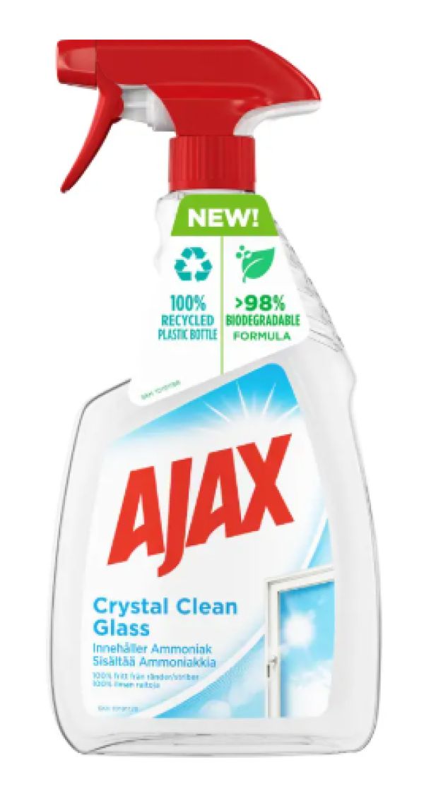 Ajax Crystal Clean -lasinpesusprayn uusi tehokas ja vegaaninen koostumus puhdistaa lasit viiruja jättämättä, mutta on huomaavaisempi planeetalle.