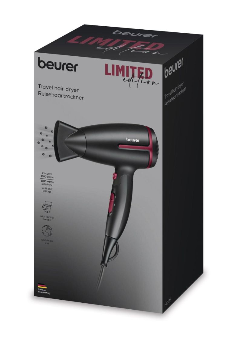 Beurerin tehokas mutta kompakti HC 25 -matkakuivain on ihanteellinen kumppani lomallesi. Sitä voi käyttää kaikkialla maailmassa, ja integroitu ionitoiminto antaa hiuksille lisää kiiltoa. Taitettavan kahvan ansiosta se vie vain vähän tilaa matkatavaroissasi.