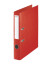 Punainen muovikantinen mappi kätevällä vipumekanismilla.