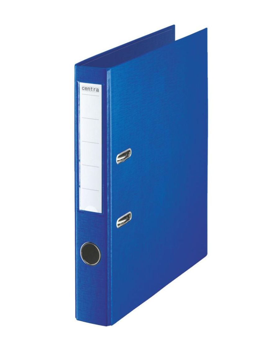 Sininen muovikantinen mappi kätevällä vipumekanismilla.