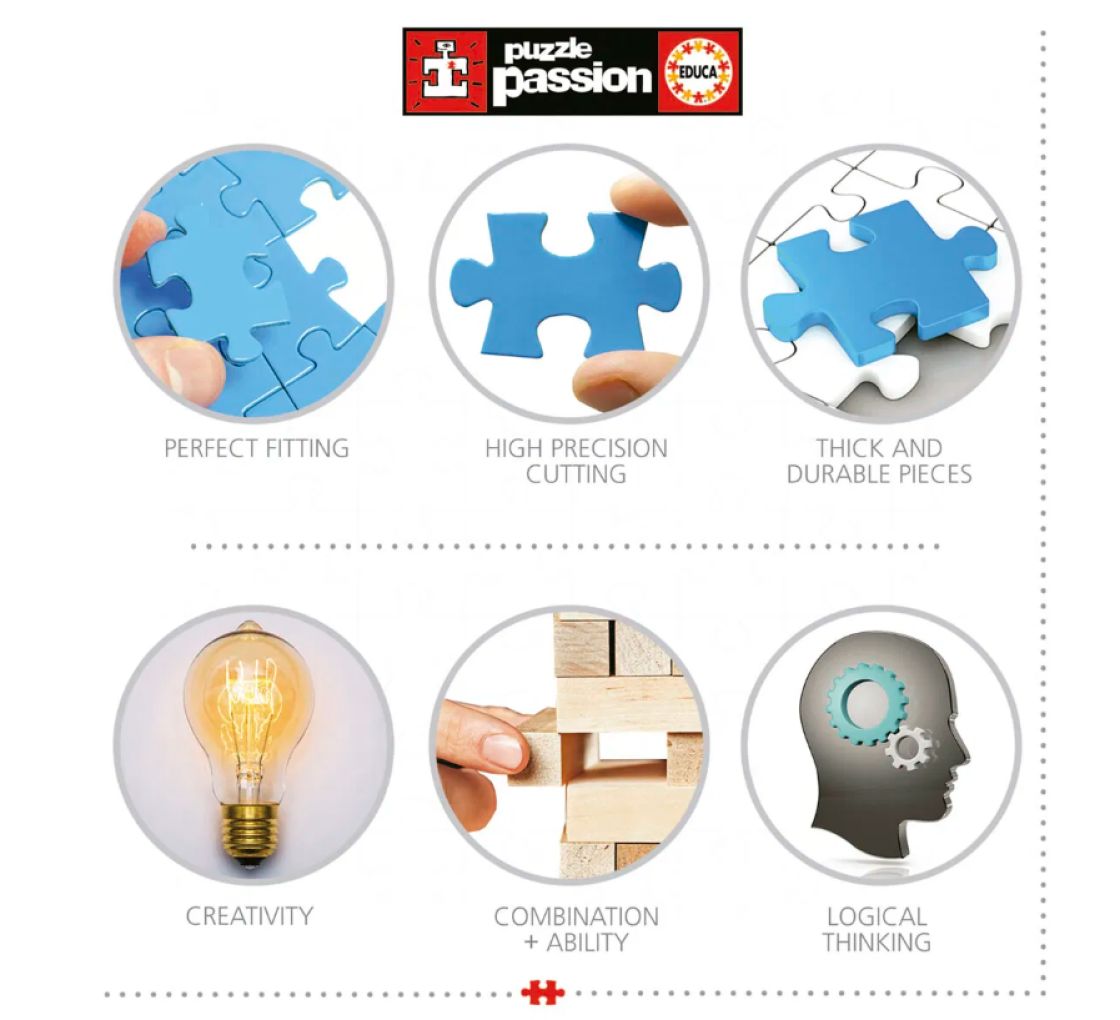 Educa® tarjoaa sinulle markkinoiden kattavimman valikoiman aikuisille suunnattuja palapelejä, joiden koot vaihtelevat 500:sta 42 000 palaan ja joissa on parhaat kuvat ja viihdyttävimmät hahmot. Kootun palapelin koko noin: 68 x 48 cm.