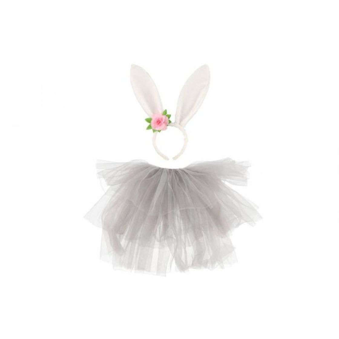 Supersuloinen vaaleanharmaa tyllihame valkoisella hännällä. Hiuspanta pupun korvilla ja kukkakoristeella. Ihastuttava asu naamiaisleikkeihin.