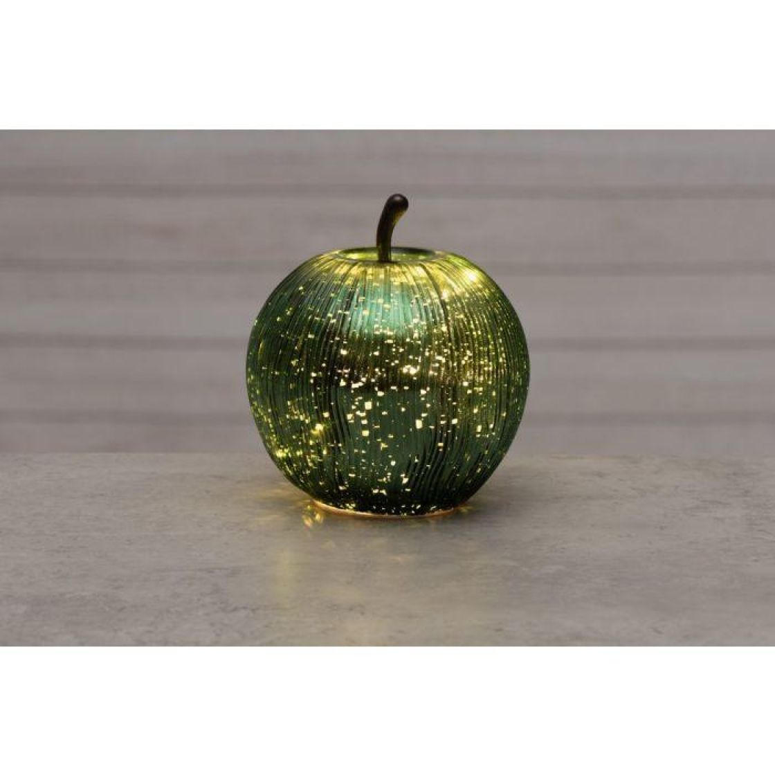 Kaunis lasista valmistettu koristeomena LED-valoilla. Tyylikäs vihreä väri.