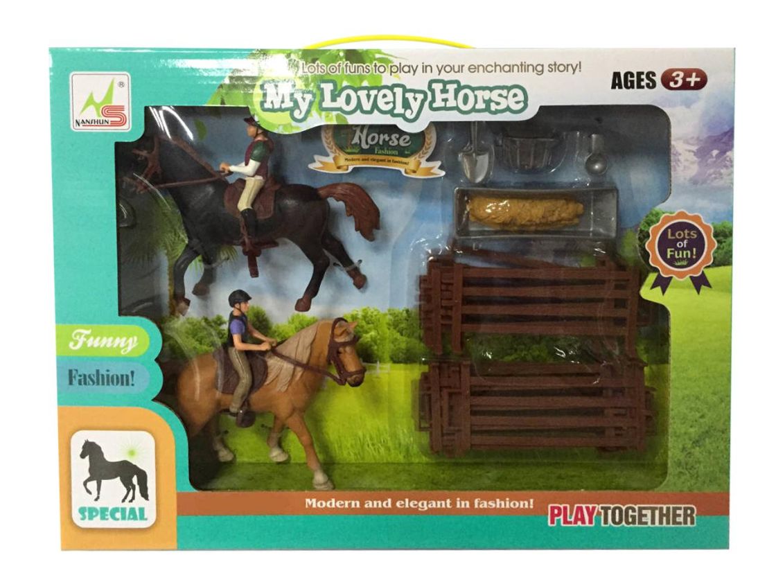 Pakkaus sisältää kaksi hevosta ratsastajineen sekä ison aitauksen.
