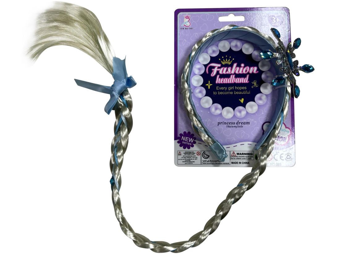 Ihanan kiiltavä palmikko kiertää pannan yli ja jatkuu pitkänä palmikkona sivulle. Pannassa upea kimaltava lumihiutalekoriste.