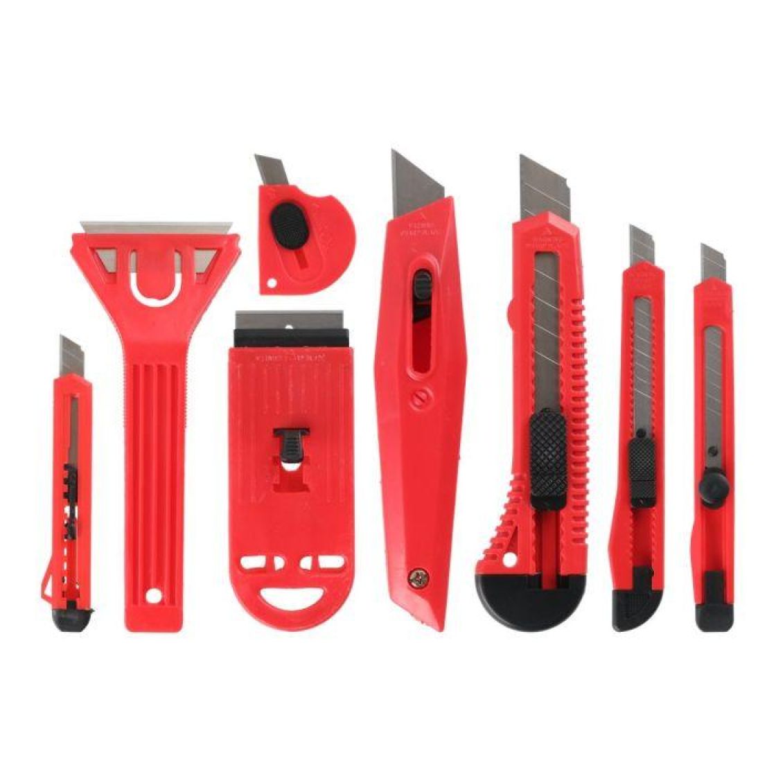 Monipuolinen setti muovirunkoisia veitsiä askarteluun: 3kpl 9 mm katkoteräveitsiä, 2kpl 18 mm veitsiä, joista toinen katkoterällä, 2kpl kaapimia sekä 1kpl pieni avainperäveitsi.