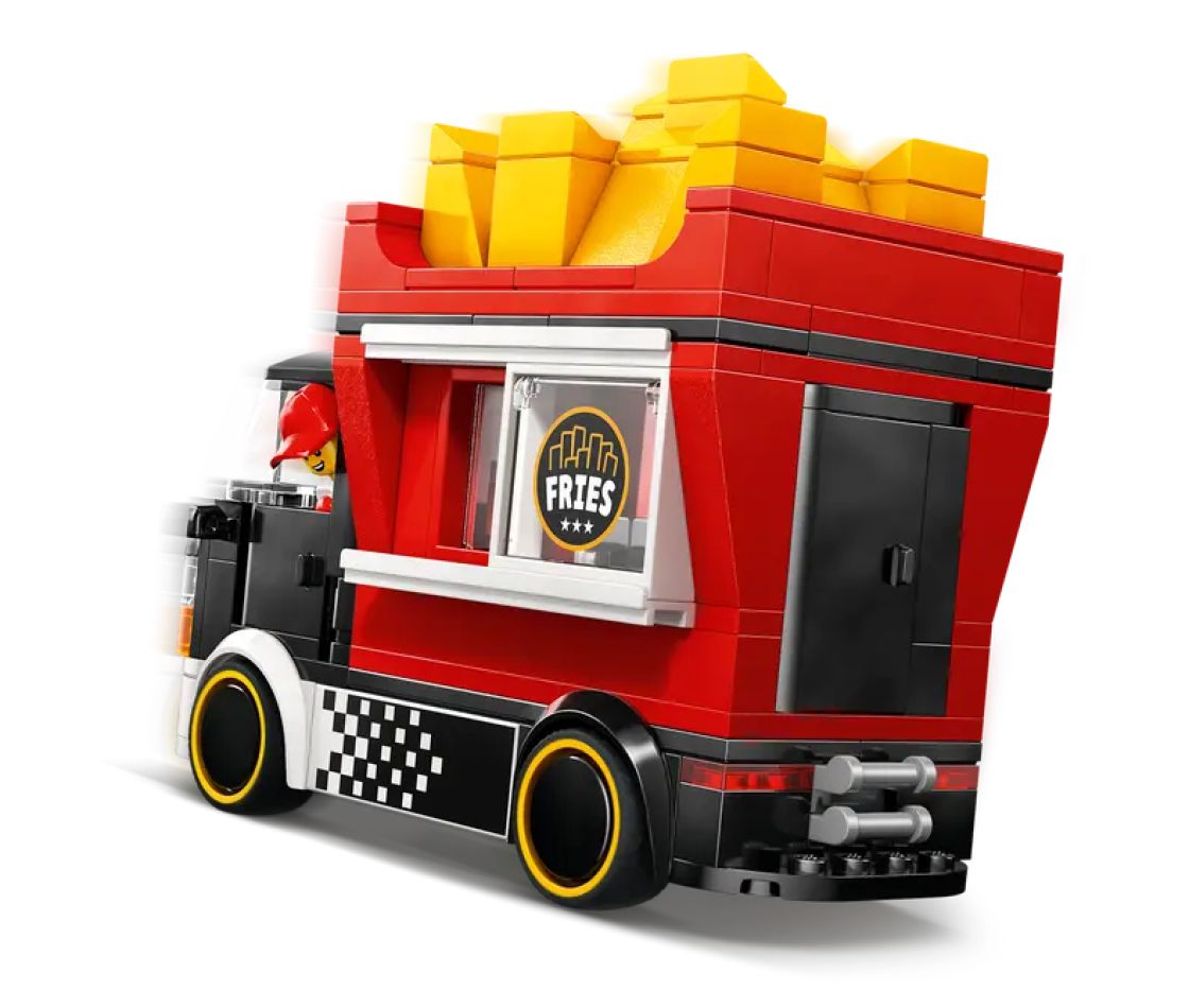 Värikkäässä ruoka-autossa on jättimäisen ranskanperunapaketin muotoinen irrotettava kioski. Irrotettavan katon alta paljastuu ruoanvalmistusalue, jossa on friteerauskeitin, mausteita ja liukuikkunalla varustettu palveluluukku. Pikaruoka-auton avautuvan konepellin alle kätkeytyy lelumoottori, ja mukana tulevat myyjän ja asiakkaan minihahmot.