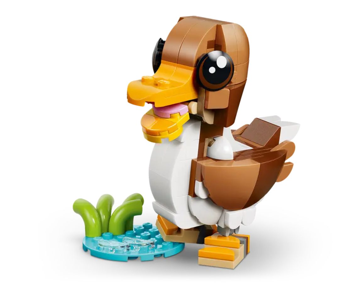 Eläinaiheisen lelun palikoista tytöt ja pojat voivat rakentaa 3 erilaista eläinhahmoa. Rakenna ensin koira, jonka pään, suun, hännän, korvat, kulmakarvat ja jalat voi asettaa eri asentoihin. Hahmolla on myös kaulapanta, luu ja vesikulho. Loihdi osista sitten tammenterhoa mutusteleva orava, jonka päätä voi liikutella, tai kasvien koristaman lammen kupeessa nököttävä ankka, jonka pään voi asettaa eri asentoihin. Leikkihetkien jälkeen mallit voi laittaa esille koristeeksi.