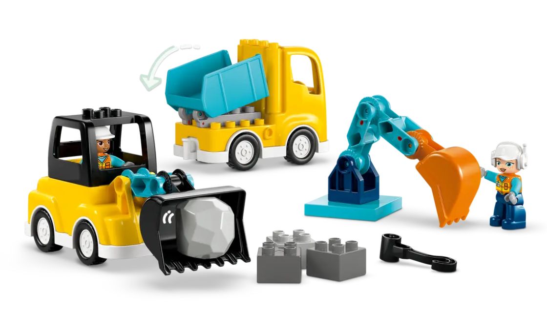 Tässä LEGO DUPLO rakennussetissä on 22 palikkaa, joista voi rakentaa 3 erilaista ajoneuvoparia: kuormaajan, jonka kallistuvalla kauhalla voi laittaa palikoita kippiauton kyytiin, kaivinkoneen ja hinausauton, jossa on kääntyvä puomi, tai saksinostolavan ja toisen hinausauton, jonka pienellä koukulla voi nostaa palikoita. Kokeillessaan erilaisia ratkaisuja eri ajoneuvojen rakentamiseksi lapset pääsevät käyttämään luovuuttaan, ongelmanratkaisukykyään, sinnikkyyttään ja hienomotorisia taitojaan.
