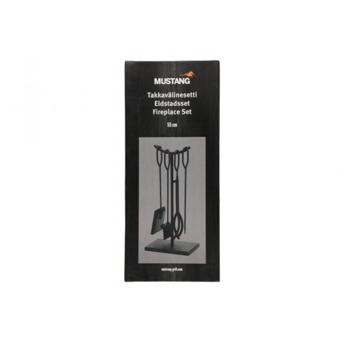 Takkasettiin kuuluu teline sekä neljä työvälinettä: lapio, harja, kohennusrauta sekä pihdit.