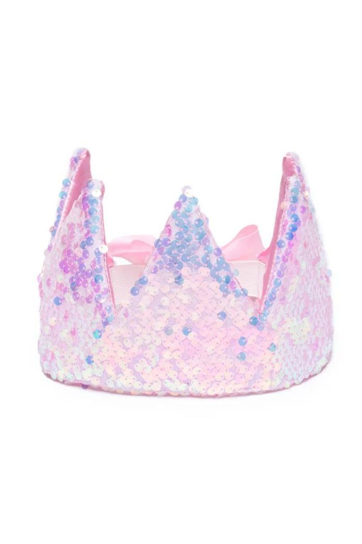 Lapselle tarkoitettu päähine. Paljetti kruunu jossa takana rusetti.