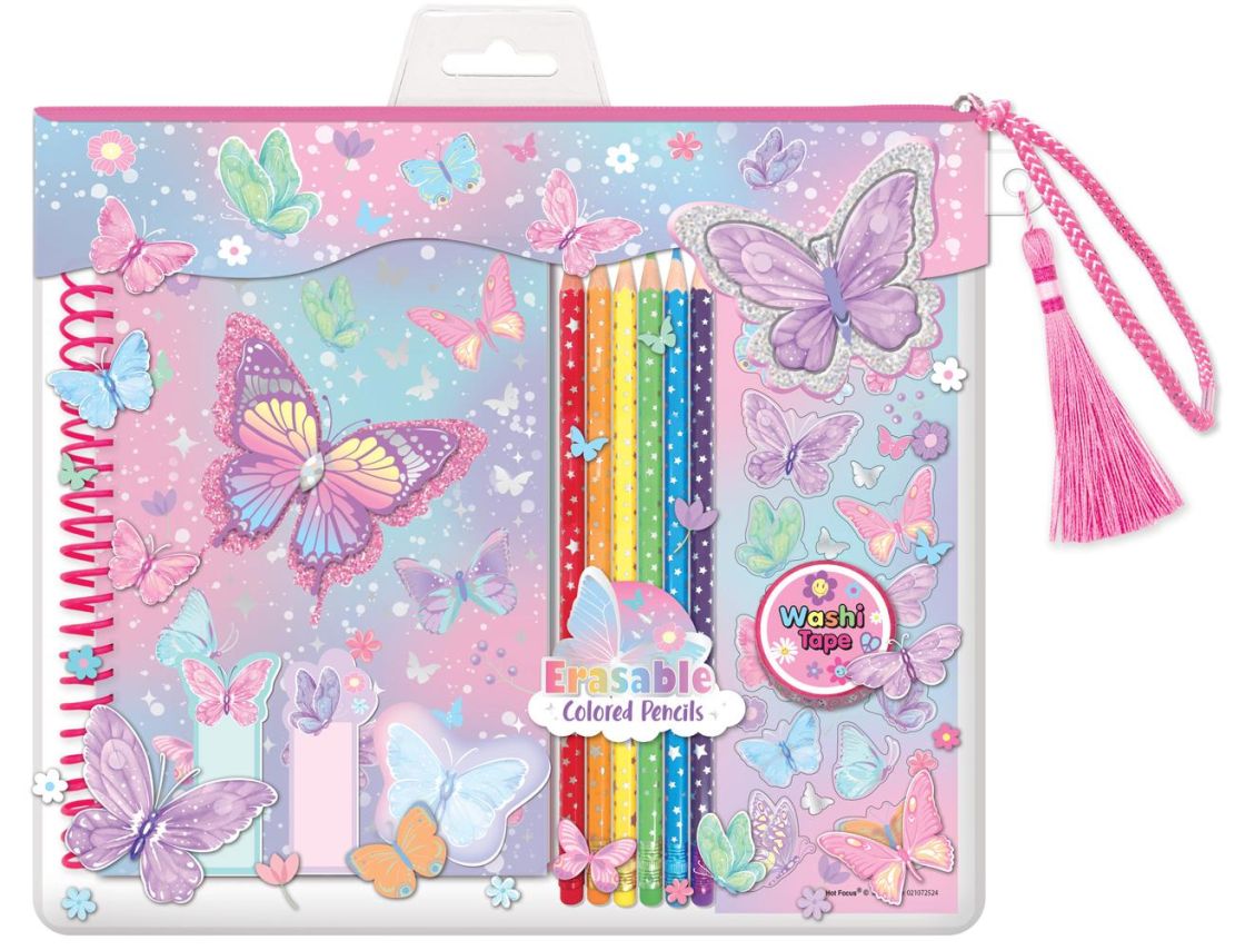 Mukana perhosaiheisia tarroja, kierrevihko sekä kuusi puuväriä, jotka ovat kumilla pyyhittävissä.