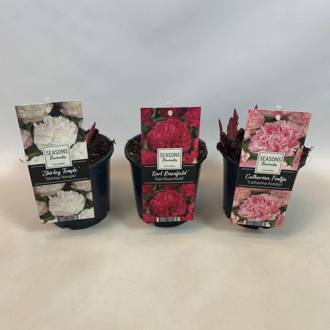 Valikoimassa erivärisiä pioneja 13 cm ruukussa.