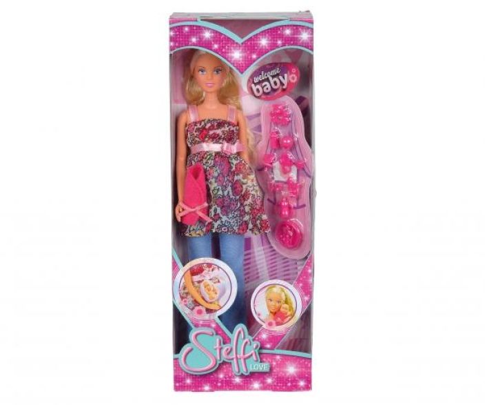 Steffillä on vauva mahassa. Vauvan saa helposti laitettua mahaan ja otettua ulos. Kun vauva on syntynyt, Steffi voi huolehtia siitä monien tarvikkeiden avulla. Pakkaus sisältää 13 osaa, Steffi nuken, vauvan sekä hoito tarvikkeita. Nuken koko 29cm ja vauvan koko n. 4cm.