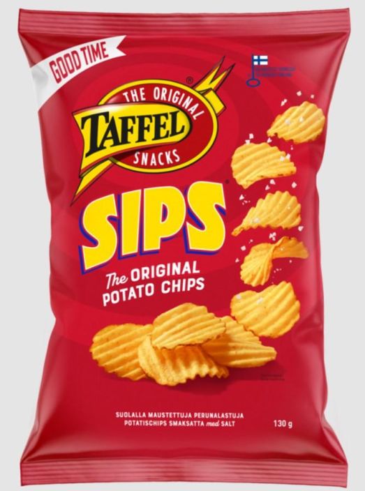 Poimutettu unelma, Taffel SIPS valmistetaan vain parhaista perunoista, suolataan taidolla sekä paistetaan korkealaatuisessa kasviöljyseoksessa kullankeltaiseksi ja täydellisen rapeaksi. Hullunhyvä myös dippisipsinä.