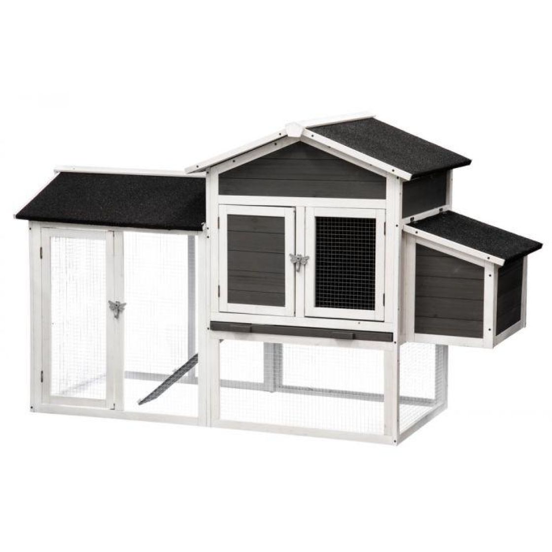 Säänkestävä huopakatto. Sekä häkkipihassa, pesäkopissa että itse kanatalossa avattavat luukut ja ovet helpottamaan puhdistusta ja munien keräystä. Kanoilla kulku rampin avulla vapaasti taloon sisälle ja sieltä ulos.
