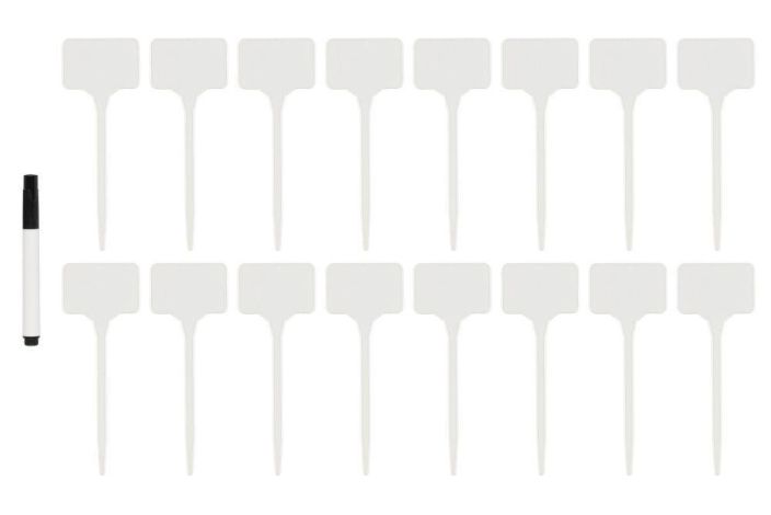 Muoviset nimikyltit, joiden avulla taimet on helppo merkitä tunnistamista varten. Mukana kynä.