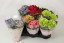 Valikoimassa puna-, valko- ja sinikukkaisia terassihortensioita 23 cm ruukussa.