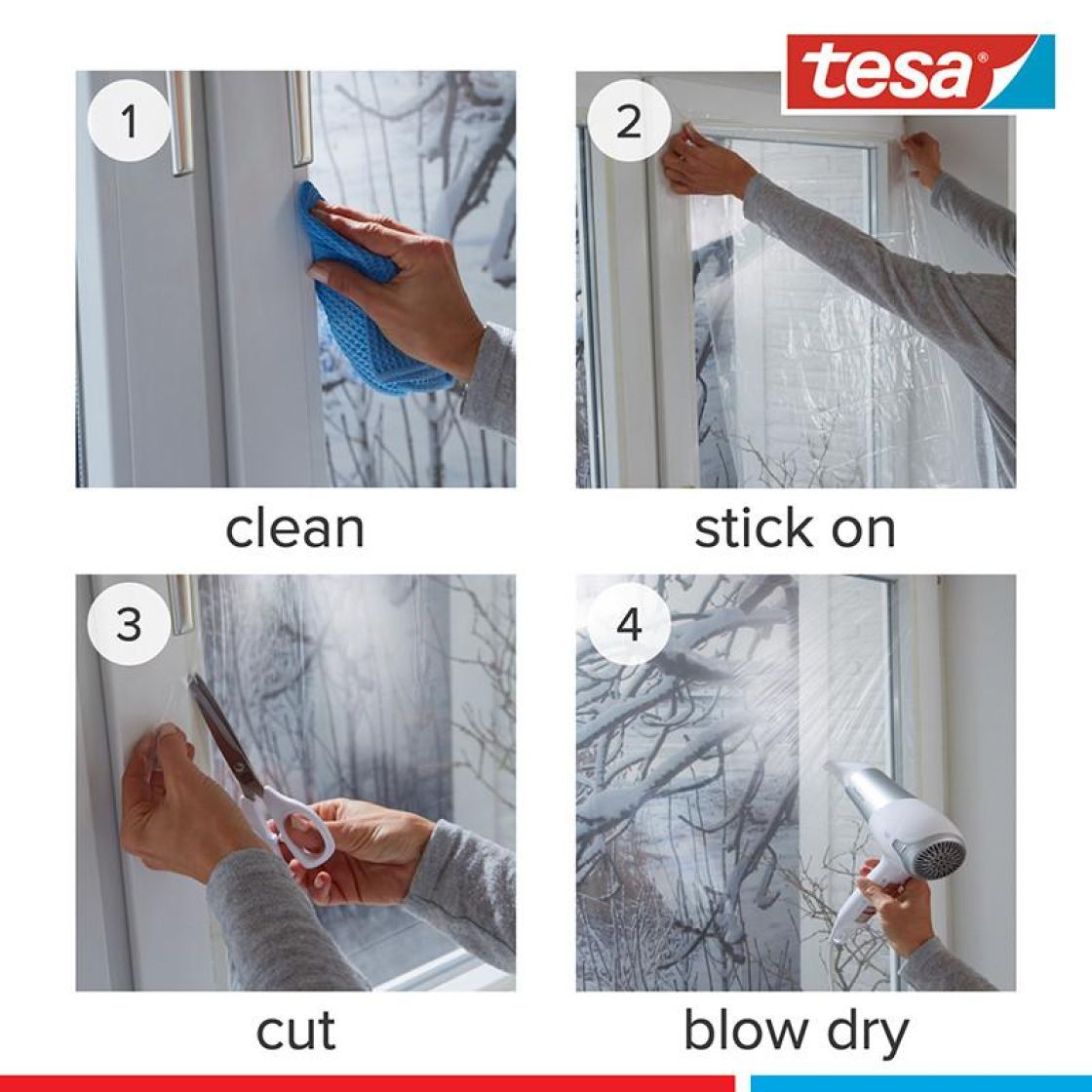 Ikkunakalvo on helppo kiinnittää mukana tulevalla kaksipuolisella teipillä. Tasainen pinta saadaan aikaan venyttämällä kalvo kireäksi ja lämmittämällä sitä esimerkiksi hiustenkuivaajalla.