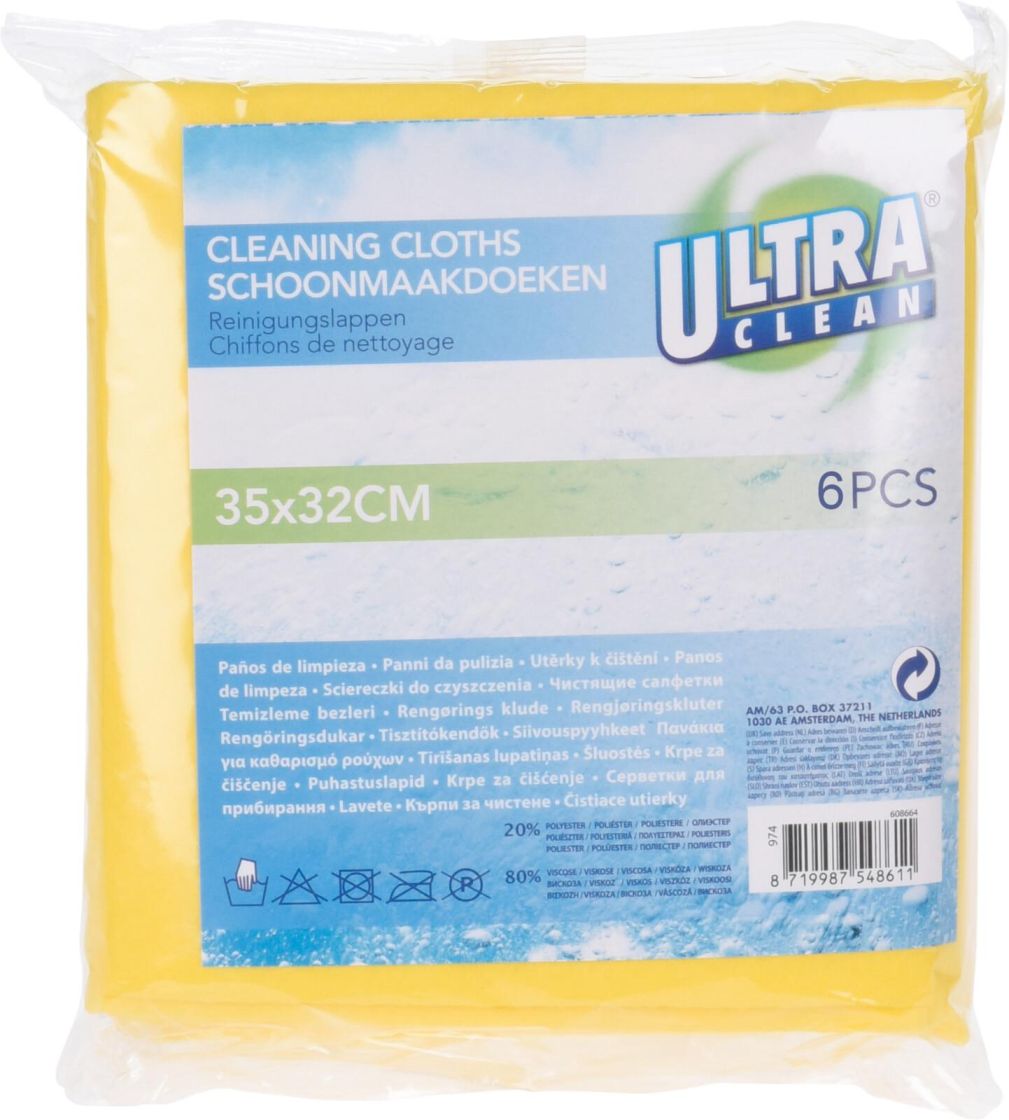 Siivousliinoja kuuden kappaleen paketissa. Liinojen koko 35x32cm.